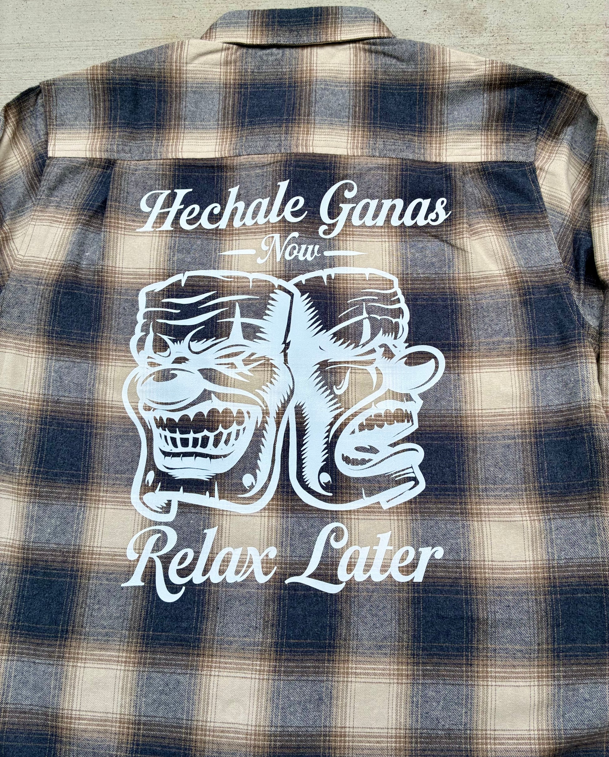 Vintage style flannel. Hechale Ganas Now Relax Later Design in Back.